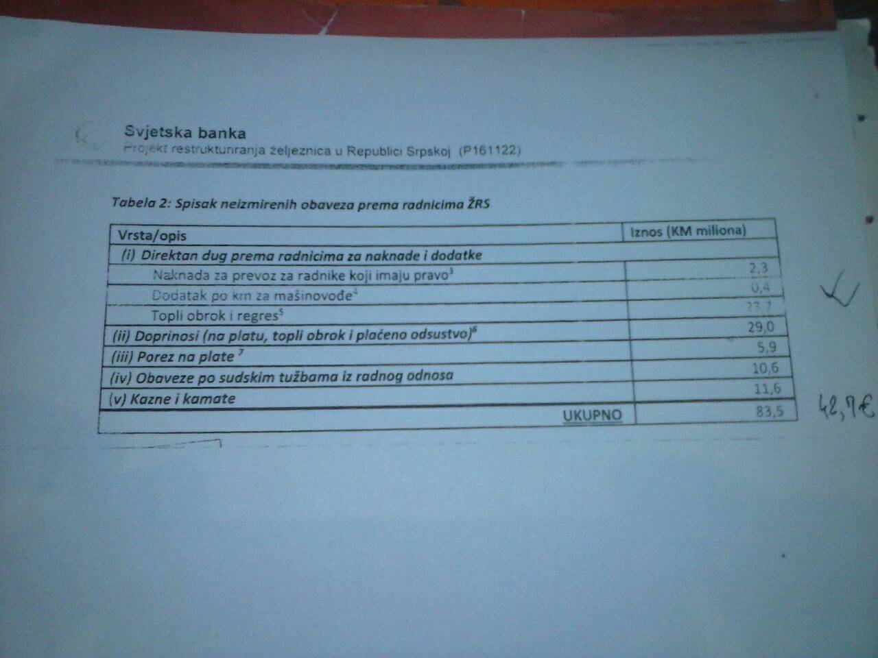 Naime, Svjetska banka je u dokumentu „Projekat restrukturiranja željeznica u Republici Srpskoj“ objavila tabelu u kojoj su precizno navedene sve neizmirene obaveze prema radnicima Željeznica RS, a koje ukupno iznose 83,5 miliona maraka, što je daleko preko, do sada, spominjanih cifri.
