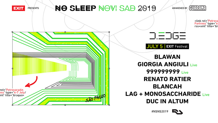 Specijalno za ovu priliku, u petak 5. jula na #NSNS2019 dolaze furiozni britanski techno mag Blawan, izuzetna italijanska muzičarka Giorgia Angiuli, te njeni sunarodnici iz trenutno jednog od najtražnijih elektronskih tandema 999999999! Tu su rezidenti kluba, južnoamerička heorina BLANCAh i srpsko-brazilski duo Duc in Altum, koje u pohodu na Petrovaradinsku tvrđavu predvodi osnivač kluba D-edge Renato Ratier, dok će ove noći jedan od centralnih termina zauzeti domaći izvođači i No Sleep rezidenti u svom premijernom, zajedničkom “live” setu Lag i Monosaccharide!
