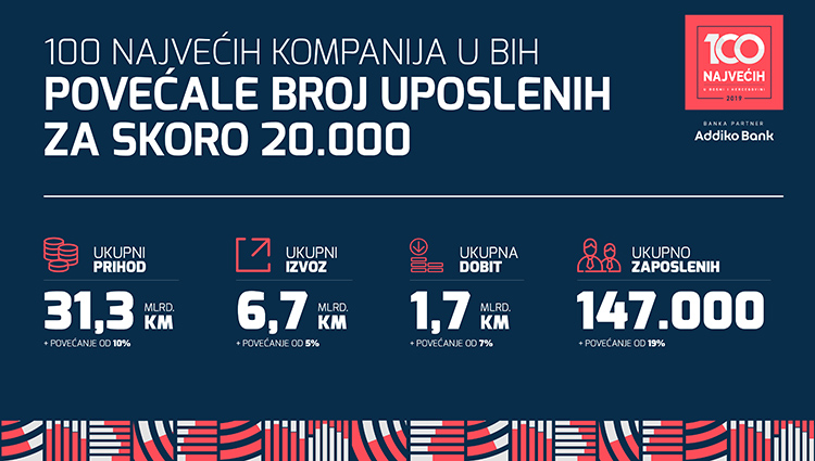 Izvoz im je porastao 5%, što u zbiru iznosi 6,7 milijardi KM. No, najveći je pomak ipak napravljen u segmentu zapošljavanja. Broj zaposlenih u bh. kompanijama koje su rangirane na listama “100 najvećih u BiH” lani je porastao za čak 19 procenata, odnosno sa 123 hiljade u 2017. na 147 hiljada zaposlenih u 2018. godini.