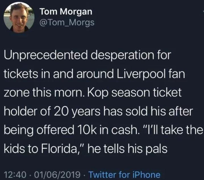 Neimenovani vjerni navijač Liverpula danas je u Madridu, pred finale Lige šampiona koje njegov tim igra protiv Totenhema prodao ulaznicu za 11 000 evra.