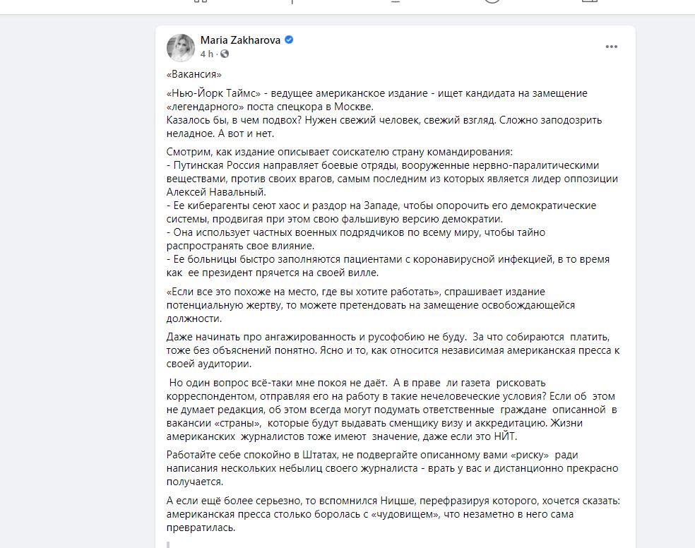 Portparolka ruskog Ministarstva spoljnih poslova Marija Zaharova predložila je listu Njujork tajms, koji traži kandidata za poziciju specijalnog dopisnika iz Moskve i u svom upražnjenom mestu opisuje Rusiju kao zemlju koja šalje vojne jedinice naoružane nervnim agensima, da ne izlaže opisanom “riziku” svog zaposlenog radi pisanja “izmišljotina”.
