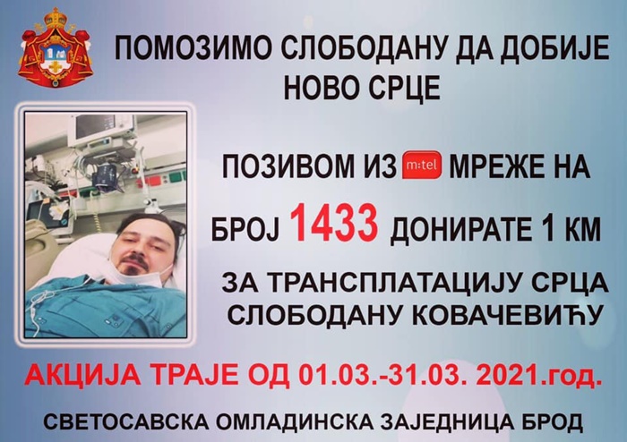 – Pomozimo Slobodanu da dobije novo srce. Humanitarni broj 1433 aktivan je u martu – saopšteno je iz Svetosavske omladinske zajednice Brod, putem koje je i aktiviran humanitarni broj.