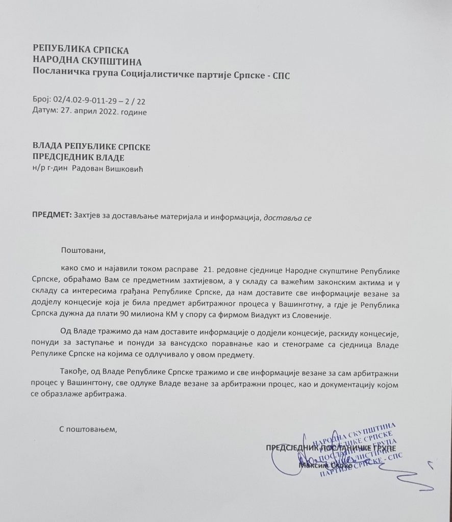 Socijalistička partija Srpske (SPS) neće odustati dok ne dobijemo odgovor ko je odgovoran što je Republika Srpska pred arbitražnim sudom u Vašingtonu izgubila spor u ukupnoj vrijednosti od preko 100 miliona KM protiv slovenačke firme Viadukt, saopšteno je danas iz SPS.