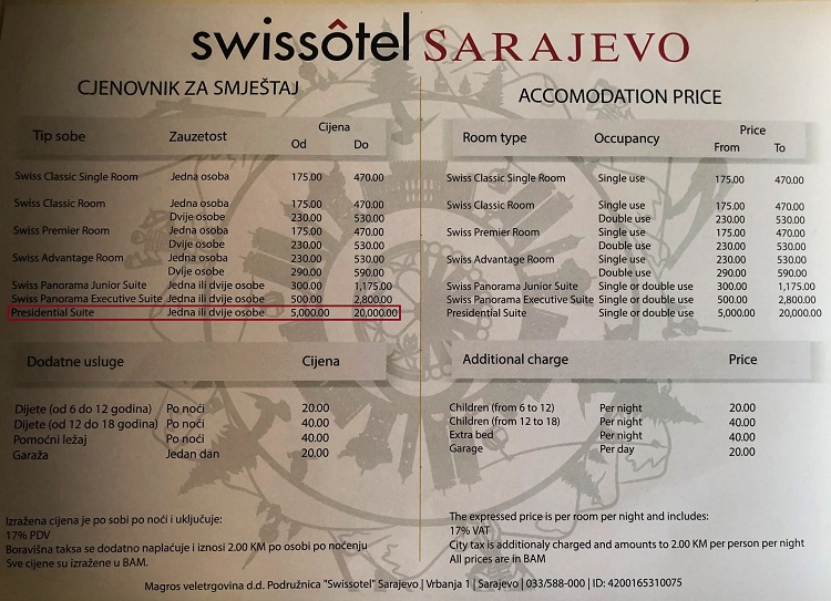 Sami ili sa još jednom osobom, za jednu noć u ovom apartmanu, treba da izdvojite od 5.000 do 20.000 KM, stoji u cjenovniku pomenutog hotela. Najjeftiniji krevet u standarnoj sobi za jednu osobu u ovom objektu košta 175 KM.