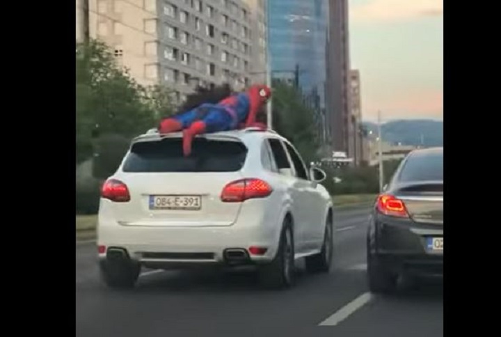Na društvenim mrežama objavljen je snimak na kojem se vidi kako osoba, obučena u kostim Spidermana, leži na krovu automobila koji je u pokretu.