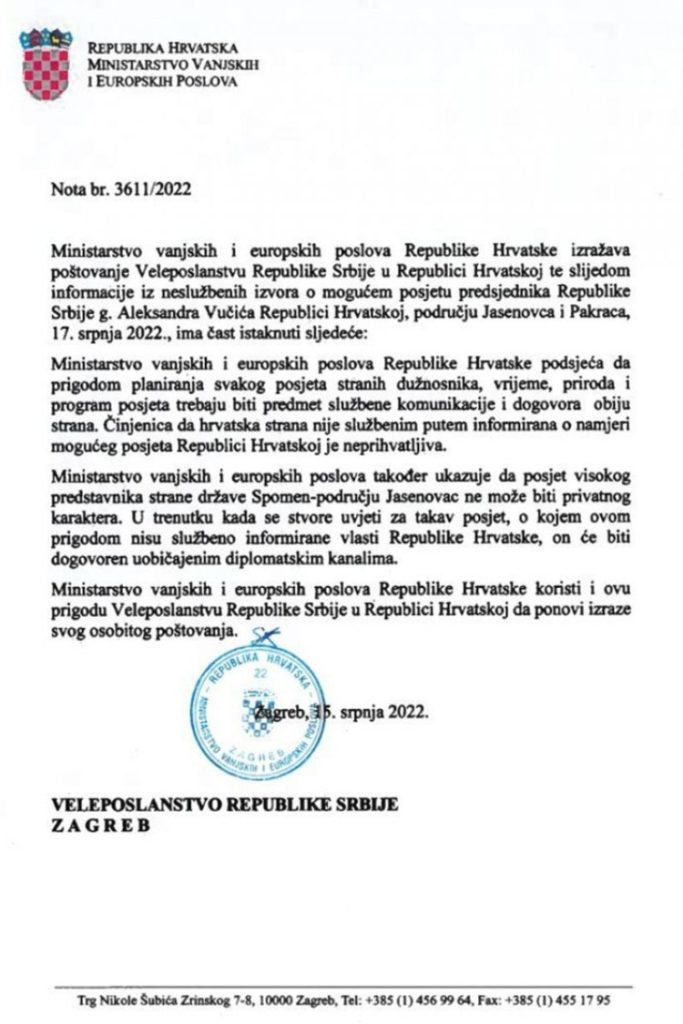 Hrvatske vlasti zabranile su predsjedniku Srbije Aleksandru Vučiću da dođe u privatnu posjetu Jasenovcu a mediji su došli do tog dokumenta.