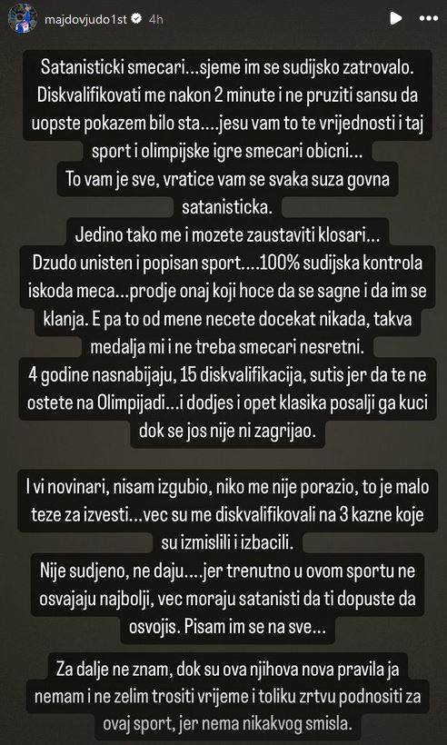 – Satanistički smećari, sjeme im se sudijsko zatrovalo. Diskvalifikovati me nakon dvije minute i ne pružiti mi šansu da uopšte pokažem bilo šta… Jesu vam to te vrijednosti i taj sport i Olimpijske igre, smećari obični? To vam je sve, vratiće vam se svaka suza go**a satanistička – napisao je Majdov i dodao: