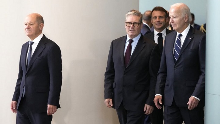 Njemački kancelar Olaf Šolc, američki predsjednik Džo Bajden, britanski premijer Kir Starmer i francuski predsjednik Emanuel Makron razgovarali su u petak u Berlinu o takozvanom “Planu pobjede“ Volodimira Zelenskog i izrazili riješenost da nastave da podržavaju Ukrajinu na putu ka “pravednom i trajnom miru“, navodi se u saopštenju pres službe njemačkog kabineta ministara.