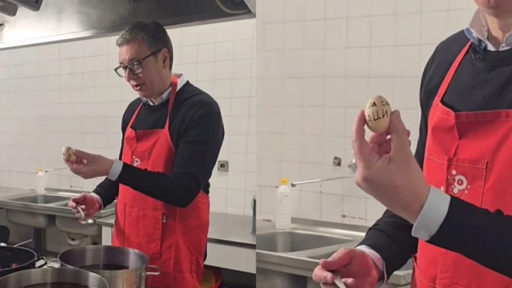 – Ja sam ovde i gospođa Joka koja me uvek ovde pazi i prirpema najbolje sve. A sad pripremamo zajedno za naše Ćacije, za ove male i velike junake i Veliki je petak – rekao je Vučić i dodao da ga je gospođa Joka naučila da pravilno farba jaja.