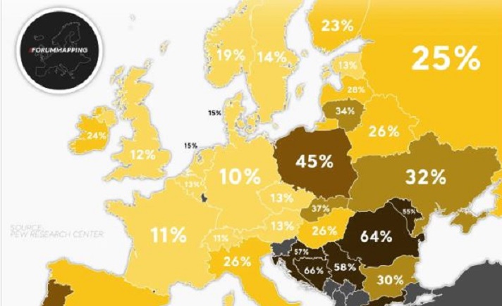 Na Instagram nalogu Forummapping objavljena je karta koja prikazuje dio stanovništva u Evropi koje sa “potpunom sigurnošću vjeruje u Boga”, a na osnovu istraživanja Pew Research Centra.