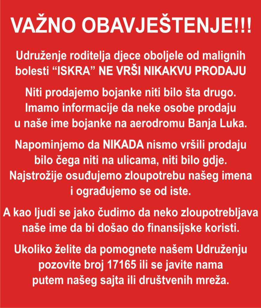 Udruženje roditelja djece oboljele od malignih bolesti “Iskra” iz Banjaluke izdalo je važno upozorenje za građane nakon što su nepoznate osobe prodavale bojanke u njihovo ime, navodeći da oni ne prodaju ništa.